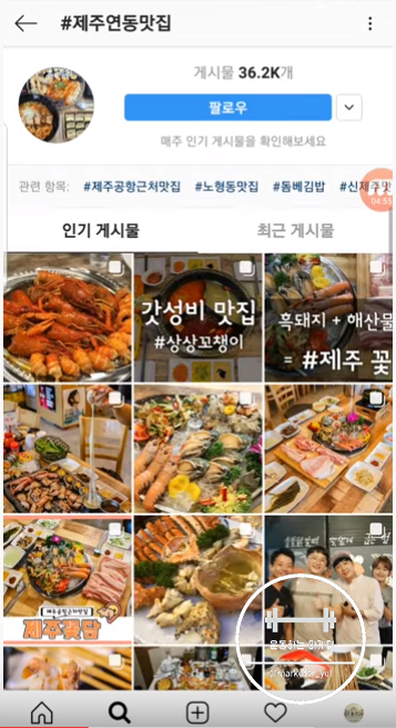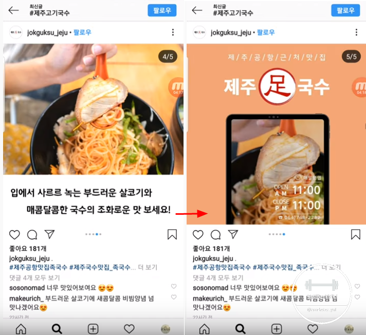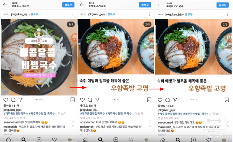 자, 지금 #제주고기국수 라고 검색을 해 봐서 최근게시물 탭을 눌러 내려봤어요. 이렇게 다 이미지 사진만 나오는 피드들에서 저희가 만든 이 피드가 뿅 하고 들어가있죠? 확실히 다른 사진들에 비해서 눌러보고싶게 생기지 않았나요? 해서 눌러보면 여러장의 카드뉴스가 차례로 나오고,