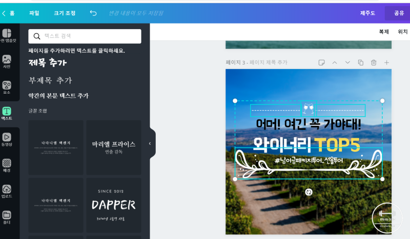 첫번째 두번째 이미지는 비교적 간단하게 직선들로 이루어진 박스를 만들어 제목을 넣고 따옴표 요소를 활용해 꾸며주었다면, 예시로 든 와이너리 투어 카드뉴스 썸네일은 좀 다양하게 넣어봤어요. 뭔가 와인포도나무의 덩쿨을 느낌의 프레임이 있었으면 좋겠다 싶어서 비슷한 모양을 요소 >> 라인 에서 찾았는데 저게 양쪽으로 되어있지만 사실은 한쪽이예요. 그래서 잘 붙여주었습니다.