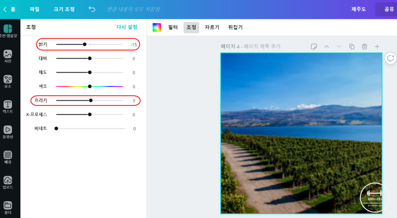 여기서 이미지는 배경의 역할을 하고, 텍스트가 눈에 더 들어와야하기 때문에 조정값을 통해 밝기 및 흐리기를 조절해서 사진을 약간 다운시켜줍니다. 이 조정값은 정해진 정답이 아니라 업로드할 사진의 퀄리티에 따라서 알맞게 조절하시면 될 것 같아요.