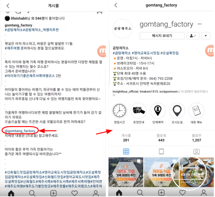 그러면 어? 여기가 정확히 어디지? 하면서 스크롤을 내려 본문을 보개되고, 본문 속에서 업체의 계정정보를 찾아 클릭을 하면 오른쪽처럼 업체의 계정으로 연결이 되요. 그럼 영업정보를 바로 볼 수가 있죠? 운영시간부터 포장가능여부, 예약문의 등등.. 그리고 피드속에 어떤 메뉴가 있는지.. 그런걸 확인할 수 있게 되는거죠. 이 식당의 장점은 아이들에게 먹일 수 있는 메뉴가 많다는거예요. 실제로 제주도를 여행해보면 애들 먹일만한게 없는 경우가 많거든요.