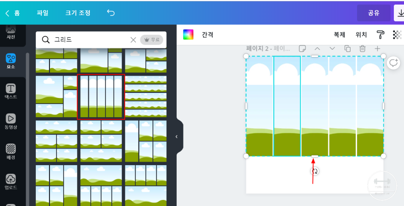 요소 >> 그리드 부분에서 원하는 분할의 그리드를 선택해 주세요. 보여줘야 할 이미지가 몇장이냐에 따라서 선택하는 그리드도 달라지겠죠? 이번에 제작한 카드뉴스에서 설명해야할 이미지는 총 5장 이었기 때문에 5분할 그리드를 선택했습니다.