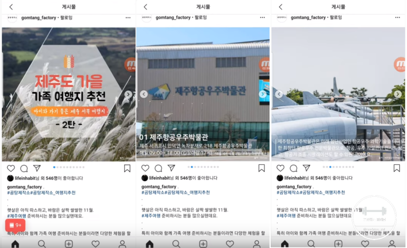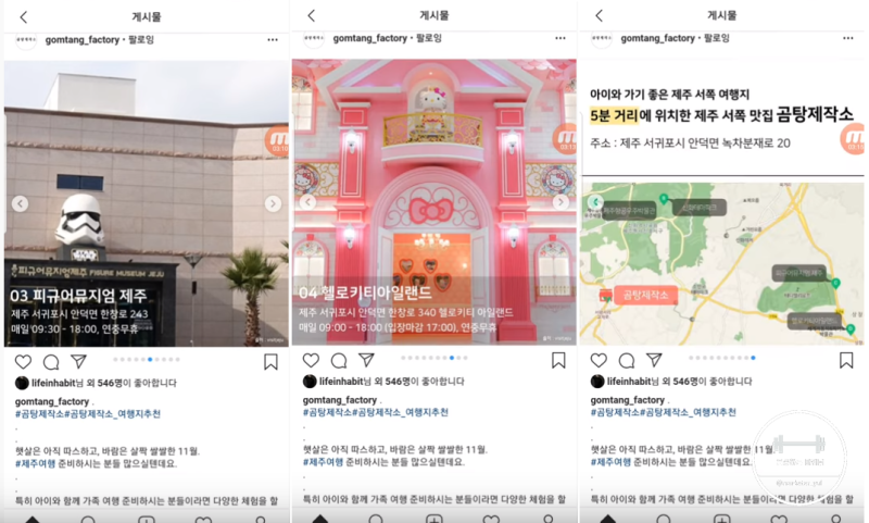 위 정보성 컨텐츠를 볼께요. 제주도 가을이고 서브제목을 보면 아이와 가기 좋은 제주 서쪽 여행지 예요. 왜 서쪽이냐? 이 컨텐츠를 제공하는 사업주의 사업체가 서쪽에 있는 식당이기 때문이죠. 저 정보성 카드뉴스의 첫장을 보고 사진을 밀어서 다음장으로 넘기면 바로바로 휙휙 넘기는게 아니라 이미지 하단에 적힌 텍스트를 또 읽어보겠죠?
