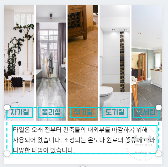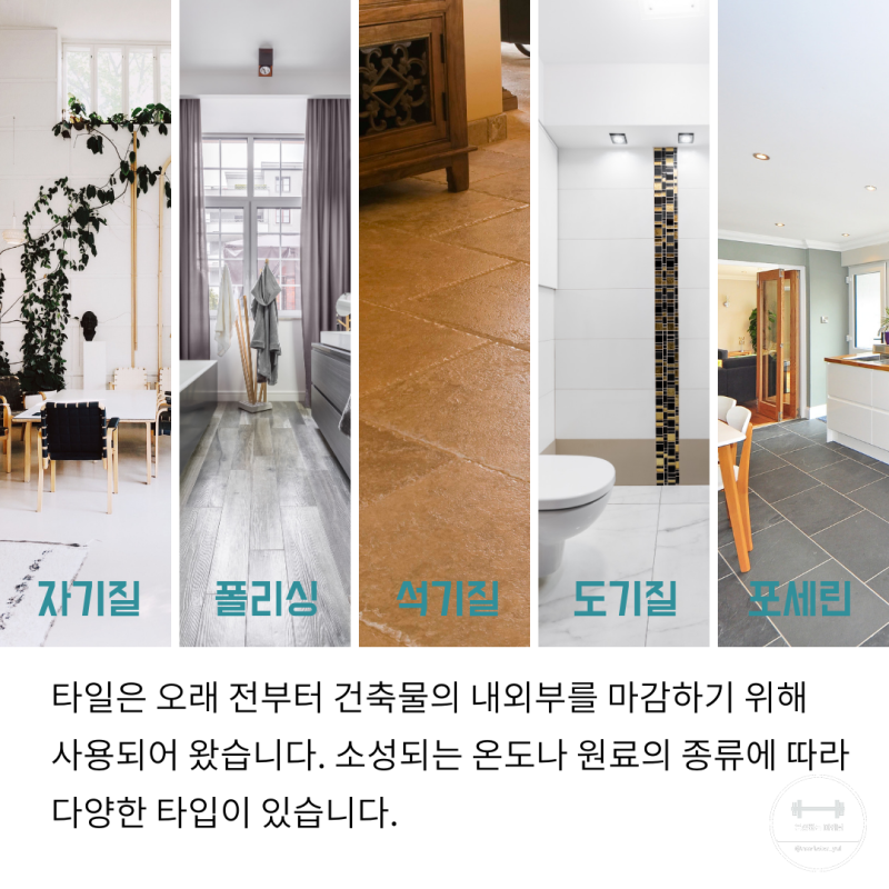 인테리어에서 빠질 수 없는게 자재 선택 부분이죠? 타일의 여러가지 종류에 대해서 설명해 놓은 블로그 속에서 위와 같은 카드뉴스를 제작했어요. 이 부분은 제일 첫장은 아니고 아마 둘째장 정도가 될 것 같네요~