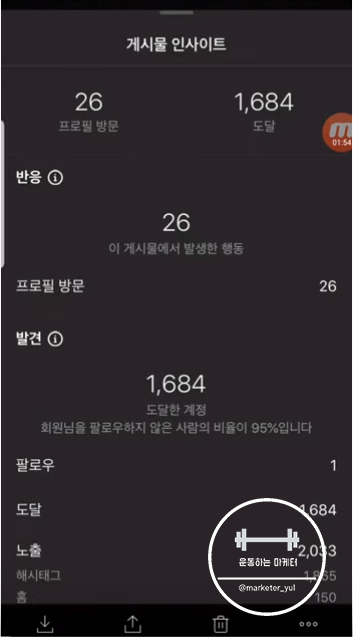 위 예시는 맛집 컨텐츠에 대한 인사이트이고, 캡처 하루 전날 업로드 된 컨텐츠입니다. 맛집컨텐츠는 지역명_아이템 의 해시태그가 굉장히 중요한 아이템이예요. 위의 인사이트 수치를 보면 노출이 2,033인데 해시태그 유입이 1,865 죠? 이 말은 90% 이상이 해시태그 검색을 통해 들어온거라는거죠.