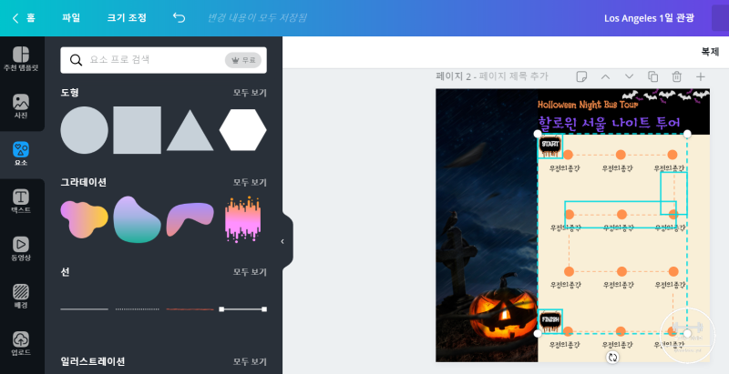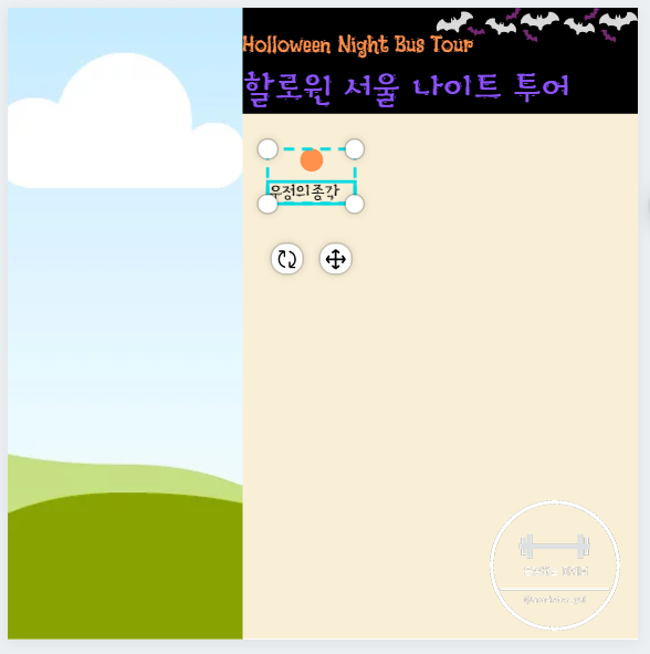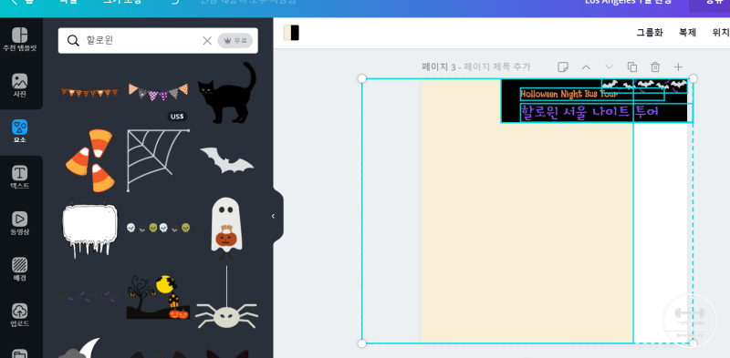 여러가지 꾸미기 요소는 요소 >> 할로윈 검색 을 통해서 어울리는 것들을 활용하시면 됩니다. 폰트도 할로윈느낌에 맞는 폰트를 사용해 봤습니다.