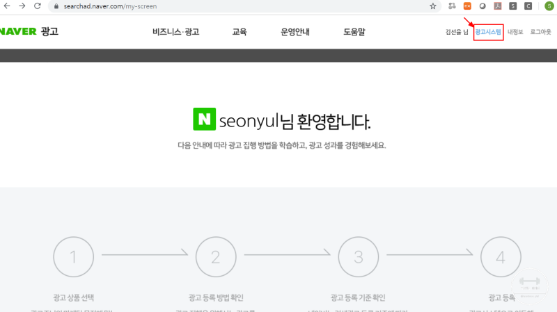 네이버 아이디로 로그인을 한 후, 우측 상단의 광고시스템을 클릭해 주세요.