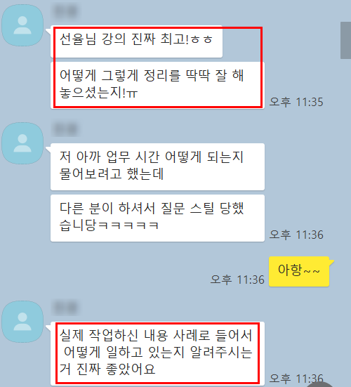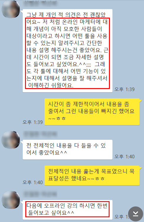 더군다나 이번 강의는 재능기부 형식으로 거의 돈을 받지 않고 진행했는데, 들으신 분들이 너무가치 높은 강의였다고, 그냥 듣기에 오히려 너무 미안하셨다는 피드백들을 또 주셔서 감사했어요.