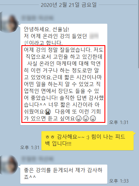 화상으로 처음 만나는 강의라서 미흡한 점이 많았을텐데도 불구하고 너무 긍정적인 피드백이 많아서 너무 뿌듯했습니다. 저의 소박한 강의가 많은 분들에게 도움이 되었다니 그 또한 너무 기쁘더라구요.