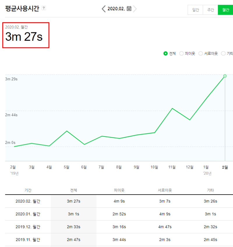 올 해, 2월 기준 평균 3분27초네요.