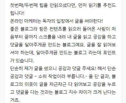 _좋은 블로그라 함은 컨텐츠를 읽으러 들어온 사람이 처음부터 끝까지 스크롤을 내려 내 글을 읽고 공감을 하고 댓글을 달아주게끔 만드는 블로그_ 예요.
