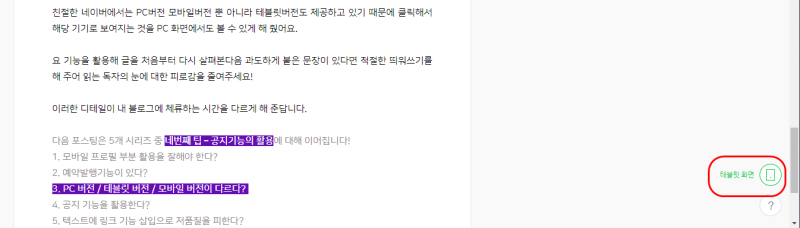 친절한 네이버에서는 PC버전 모바일버전 뿐 아니라 테블릿버전 도 제공하고 있기 때문에 클릭해서 해당 기기로 보여지는 것을 PC 화면에서도 볼 수 있게 해 줬어요.