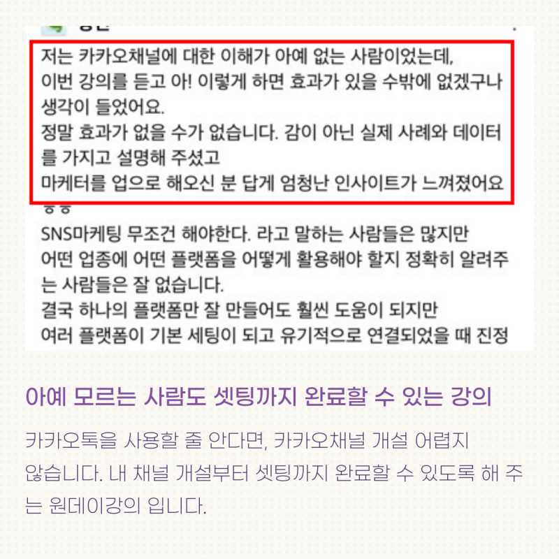 보통의 카카오채널 강의는 이론강의로 끝이나고, 강의 후 본인이 강의들었던 내용을 토대로 개설을 하고 활용을 해야합니다.