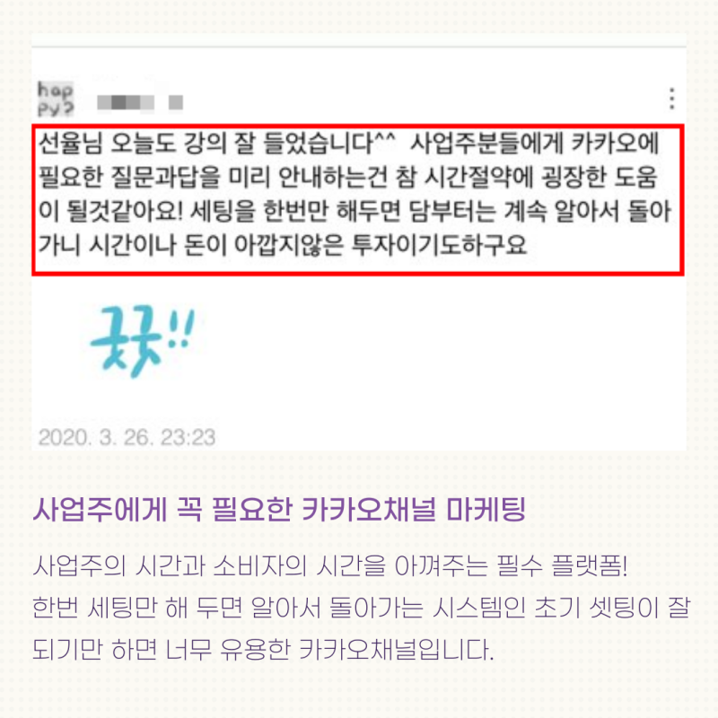 사업주의 상담시간을 줄여주고, 팬을 확보해 타겟마케팅에 최적화된 카카오채널 마케팅을 하루만에 마스터해 보세요!