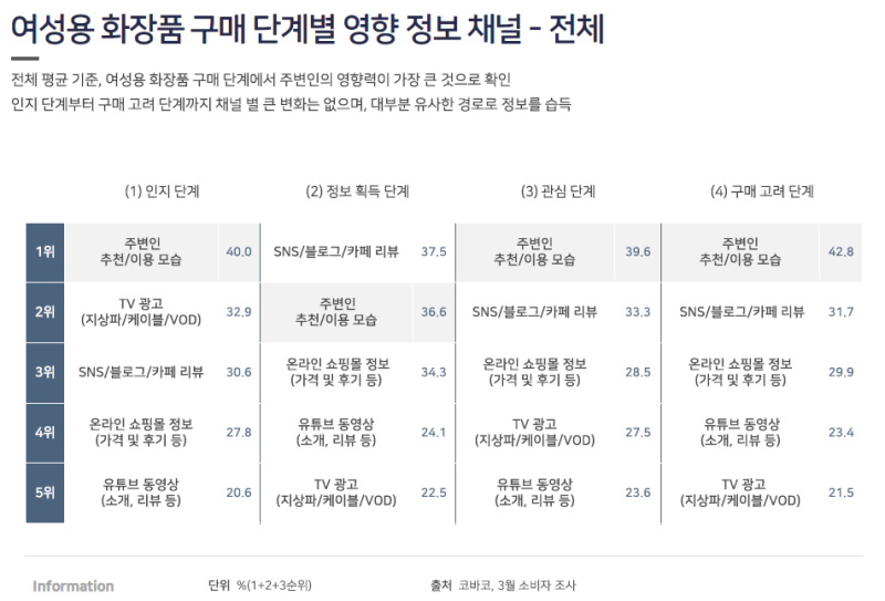 이와 더불어 양질의 체험단 이 중요한데요. 올해 3월 코바코에서 조사한 자료에 따르면, 실제로 우리나라 여성들의 화장품 구매 과정에서 가장 영향을 많이 끼치는 부분이 "주변인 추천 혹은 이용모습" 입니다.