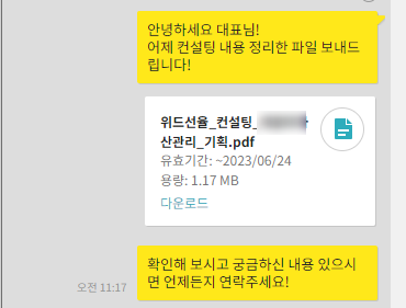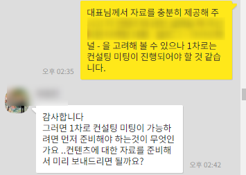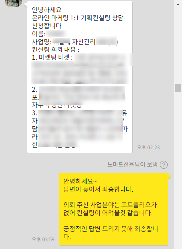 1:1 마케팅 컨설팅을 원하셨고, 사업분야가 어렵게 느껴지는 분야여서 사실 고사를 했었어요.
