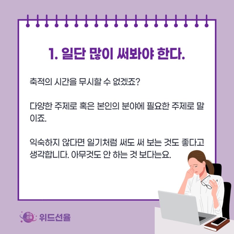 일단 많이 써봐야 합니다. 다양한 주제로 혹은 본인의 분야에 필요한 주제로 말이죠.
