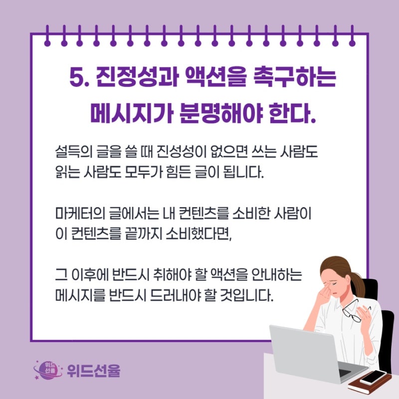 마케터나 사업주가 쓰는 글에서 빠져서는 안되는 요소가 바로 진정성과 메시지예요. 특히나 설득의 글을 쓸 때 진성성이 없으면 쓰는 사람도 읽는 사람도 모두가 힘든 글이 되거든요.
