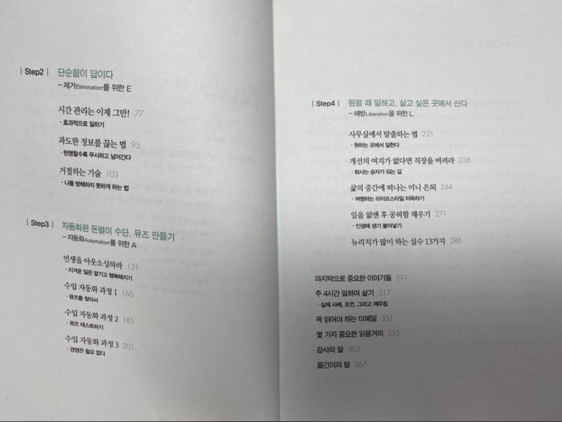 내 삶을 간단하게 정리하고, 내가 일일이 매일매일 하나부터 열까지 신경쓰고 돌보지 않아도 될수 있도록 최대한 체계적인 자동화시스템을 구축한다면 일 하는 시간을 줄일 수 있다. 라는 아주 명확한 메시지와 실제 저자의 행동 사례를 책에서 설명해 놓았습니다.