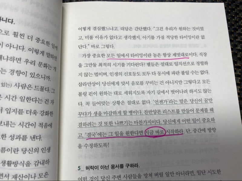 이 책에서는 적절한 타이밍이란 없으니 그 일을 원한다면 결국엔 지금 바로 시작하라고 합니다.