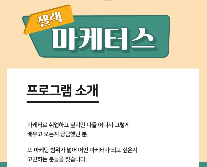 안녕하세요, <모든 비즈니스는 마케팅이다의 작가이자 브랜딩과 콘텐츠 마케팅으로 효과가 확실한 동반성장 경험을 제공하는 위드선율 입니다. 구로 청년이룸 주관 취준생을 위한 고급 교육 프로그램 셀렉 마케터스에서는 브랜드, 콘텐츠, 퍼포먼스 세 분야의 마케터 지망생들을 위한 각각 7회차...