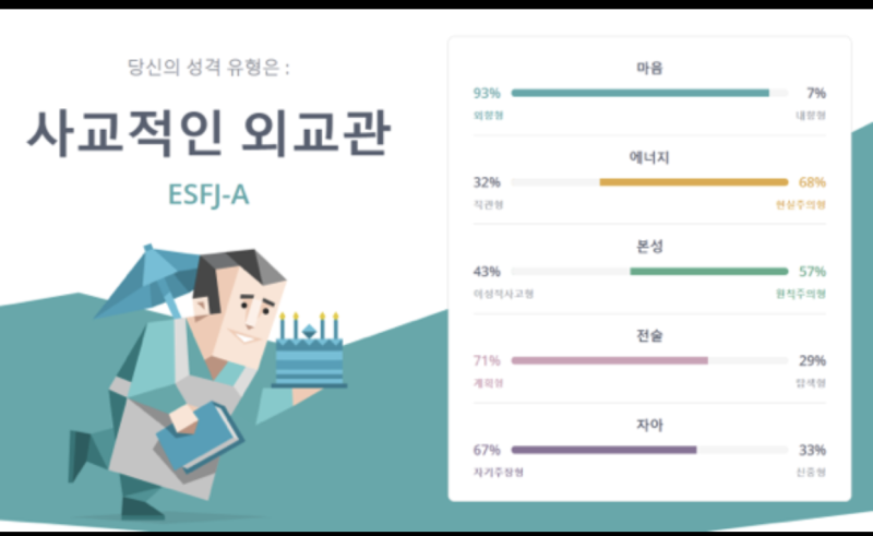 그런데 한 일년 전 다시 해 보니 ESFJ로 바꼈더라구요.
