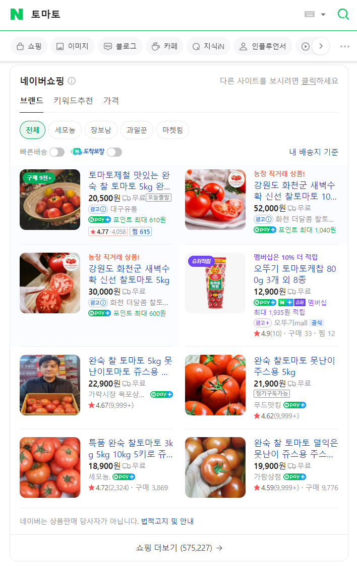 네이버쇼핑에는 57만여개 이상의 토마토 판매가
